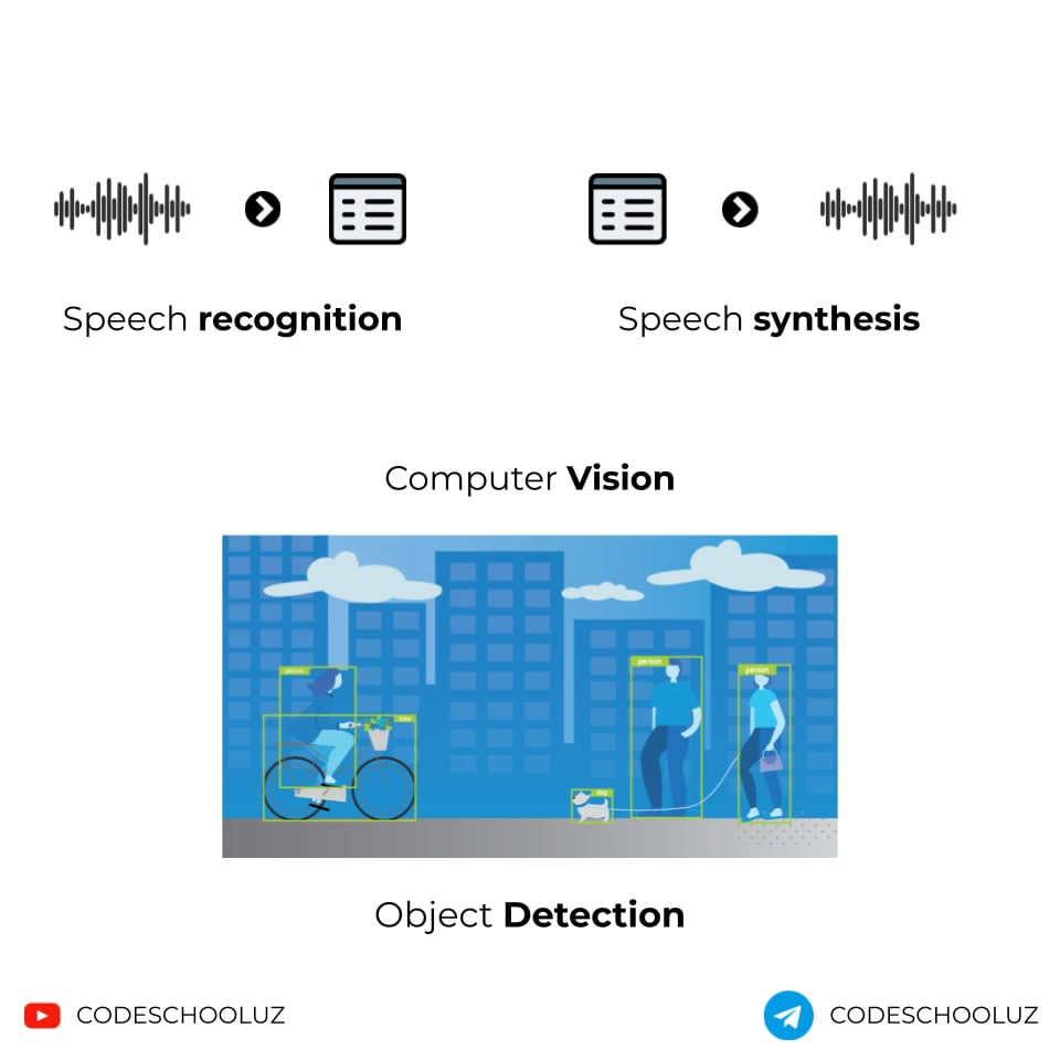 Speech Synthesis - Nutqni sintezlash, buni qisqa qilib inson ovozini sun'iy ravishda ishlab chiqarish deb ta'riflasak bo'ladi. Speech Synthesis ham hozirgi kunda juda tez rivojlanmoqda, bunga o'zimizni O'zbekistondagi kompaniyalardan ham misol qilsak bo'ldi TTS.uz. TTS uz o'zining telegram botini ham yaratgan, o'zingiz sinab ko'rishingiz mumkin - @ttsuzbot