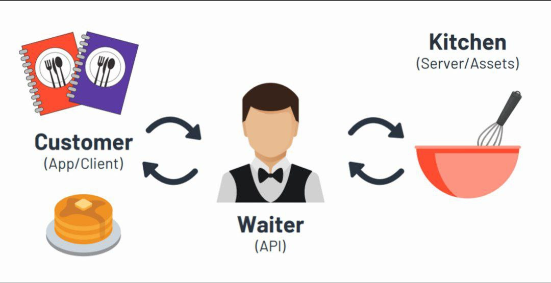 Sizning buyurtmangiz yoki so'rovingizni qabul qiladigan va oshxonaga nima qilish kerakligini aytadigan ofitsant yoki API, keyin ofitsant sizga responce(javob)ni qaytaradi, bu javob biror oziq ovqat ko'rinishida bo'ladi.