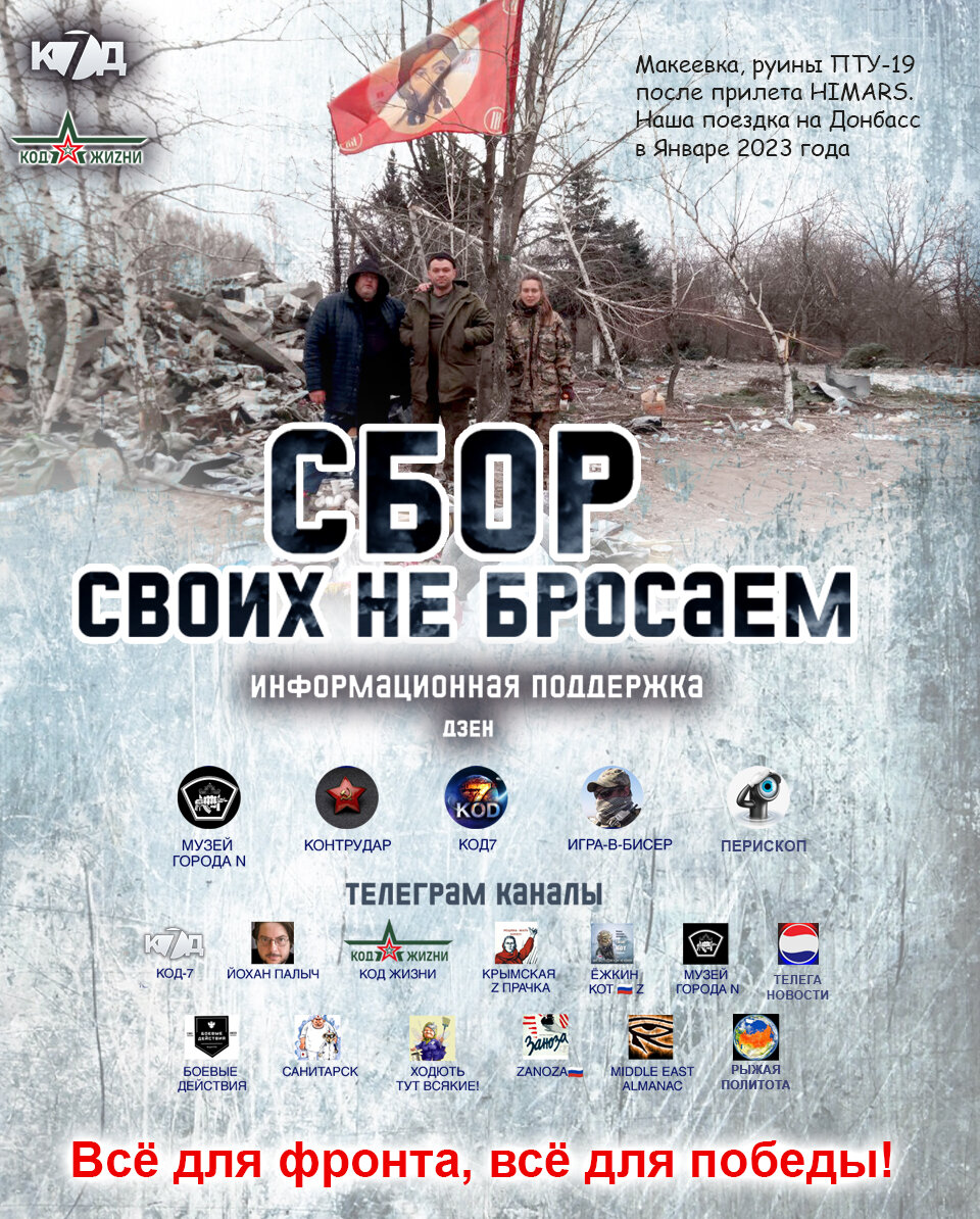 Код7 - Первый Международный pinned «СВОИХ НЕ БРОСАЕМ 3 Предыдущий сбор завершен! Все закуплено и доставлено бойцам! Отчеты тут, тут и тут. Также огромное спасибо, что помогли быстро закрыть целевой сбор на аккумуляторы для САУ, все отчеты о покупке тут. Так как остались деньги, было принято…»
