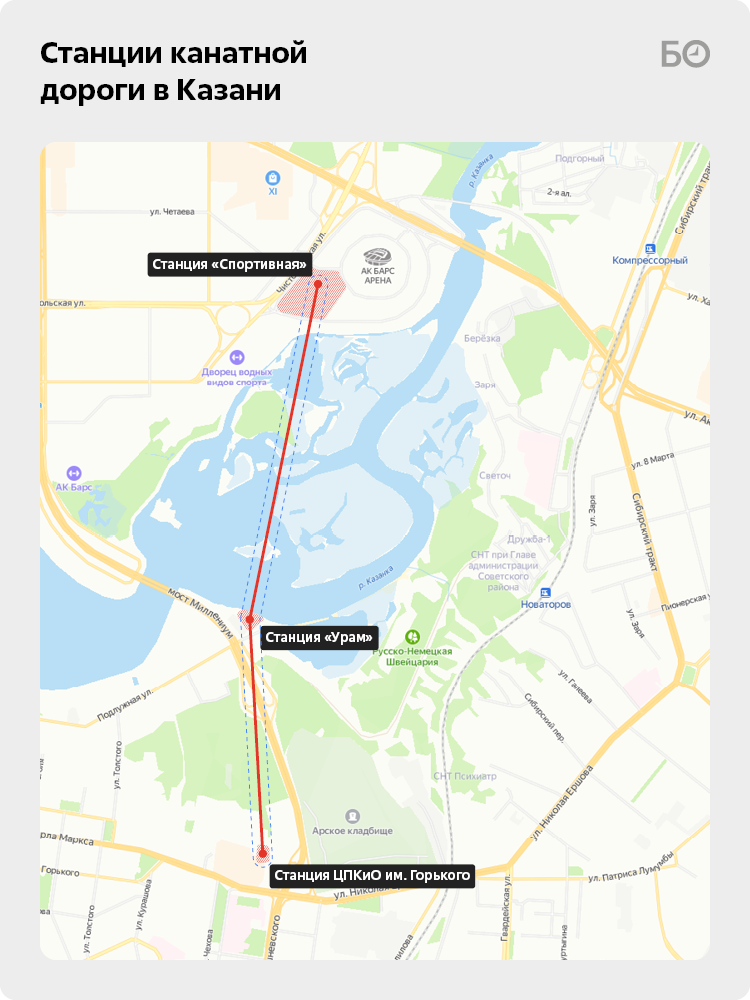 Пассажирская канатная дорога в Казани пройдет над Казанкой — этот проект обсуждается еще с прошлого года, однако теперь появились подробности. По нашим данным, остановочных станций будет три. Маршрут пройдет от парка им. Горького, затем к мосту «Миллениум» с остановкой в парке «Урам» и завершится в будущем парке «Спортивный» у стадиона «Ак Барс Арена». Протяженность «Аэромоста» в Казани (именно так назвали казанскую канатку) составит 2,9 километра.