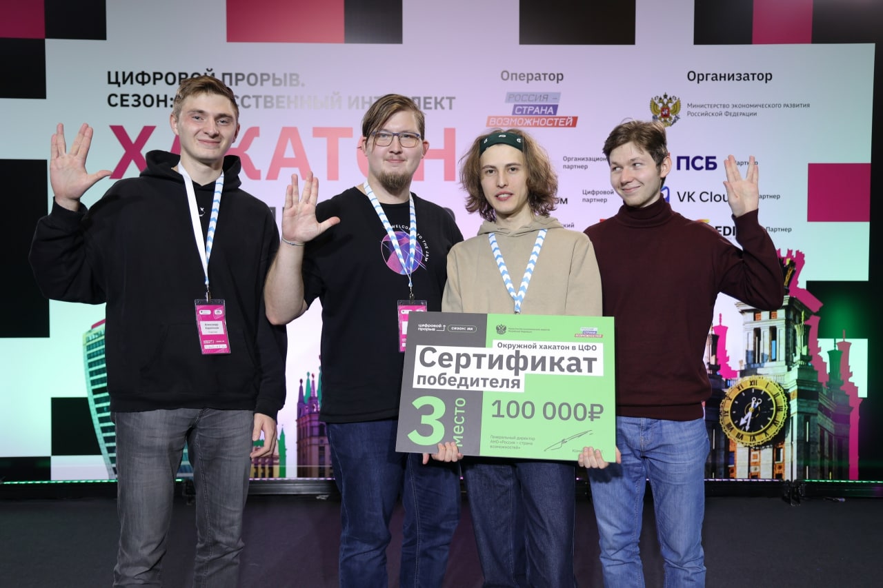 Сотрудник нашего Центра и магистрант программы "Методы и технологии искусственного интеллекта" ФПМИ МФТИ (https://cogmodel.mipt.ru/applicants), Илья Петряшин, занял 3-е место со своей командой на окружном хакатоне от Цифрового Прорыва: Сезон ИИ, проходившем в Центральном федеральном округе.