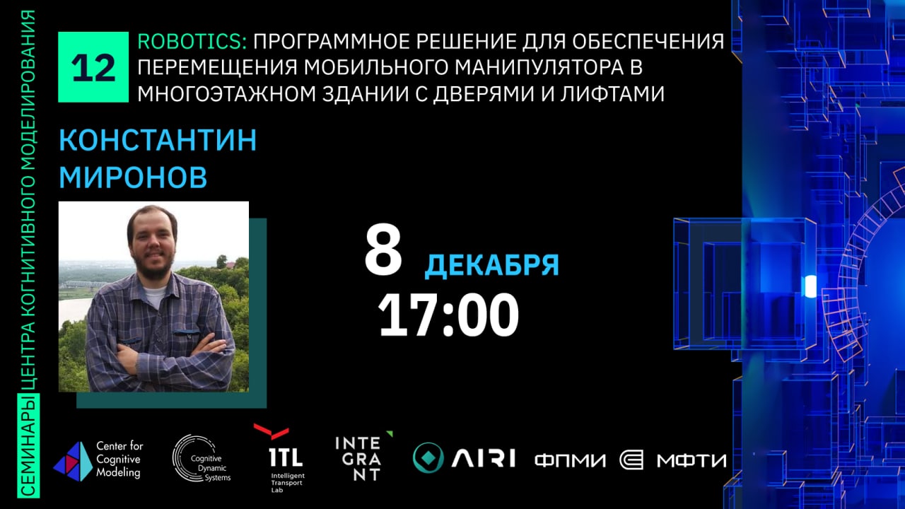 Доклад обобщает результаты работы команды Центра Когнитивного Моделирования в данной области и посвящен практическим аспектам при перемещении мобильного манипулятора в офисном здании, оснащенном дверями и лифтами. Будет описана общая архитектура системы, наши решения для задач использования лифта и открытия дверей, результаты реализации подходов на мобильном манипуляторе (платформа Husky UGV, рука UR5)