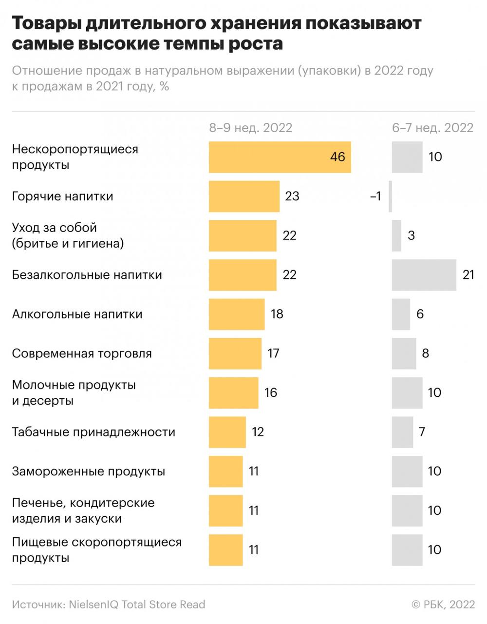 По сравнению с прошлым годом на восьмой-девятой неделе (конец февраля-начало марта) 2022 года потребительский спрос заметнее всего увеличился в категориях нескоропортящихся пищевых продуктов (+46%), горячих напитков (+23%), товаров по уходу за собой (+22%) и алкогольной продукции (+18%).