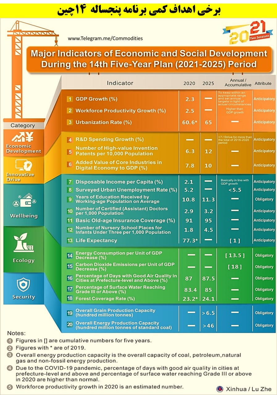 برخی سرفصلهای برنامه پنجساله 14 چین به میزان قابل ملاحظه ای ارزش افزوده و کیفیت زندگی مردم این کشور را افزایش و مصرف #انرژی و آلایندگی در هر واحد GDP را کاهش میدهد 👈 این موضوع برای سایر کشورها از جمله #ایران فرصت تولید و صادرات محصولات انرژی بر از جمله #آلومینیوم #فولاد و سایر فلزات را فراهم می آورد