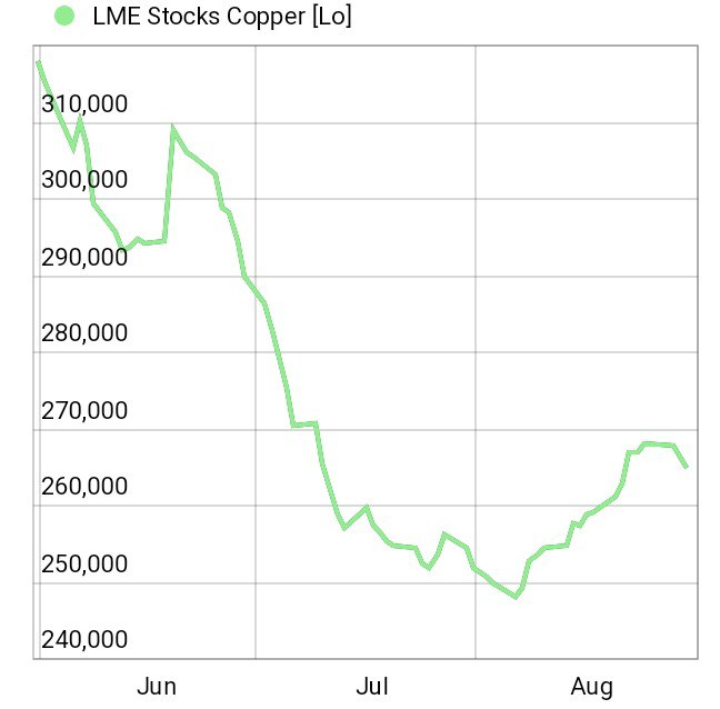 #مس موجودی قابل فروش انبارهای بازار فلزات لندن امروز ۴۶۰۰ تن 🔻 و طی ۹ روز اخیر ۱۱۰ هزار تن کاهش و به ۱۲۴.۵ هزار تن رسیده که کمترین ۱۲ ماه اخیر است