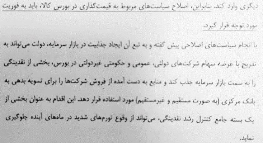در گزارش آورده شده که دولت به دنبال بازپرداخت بدهی خود به بانک مرکزی بوده و روی واگذاری مابقی سهام شرکتها در جذب نقدینگی جامعه حساب کرده و بدین منظور لازم است بورس کالا از سیاست تعیین دستوری قیمت فاصله گرفته و قیمت خوراک پتروشیمیها را نیز شفاف سازی کند