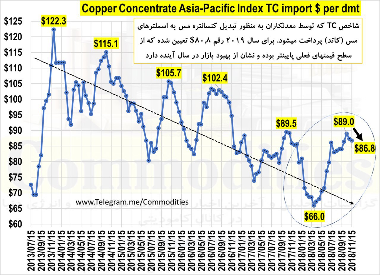 برای سال 2019 شرکتهای Antofagasta و Jiangxi اقدام به مذاکره تعیین TC کرده و نتیجه امروز رقم 80.8$ در هر تن اعلام شد که 6$-🔻 کمتر از رقم فعلی است👈 این موضوع پایین ترین حد مجاز قیمت مورد انتظار بازار بود که به معنی کمبود عرضه کنسانتره مس تعبیر میشود