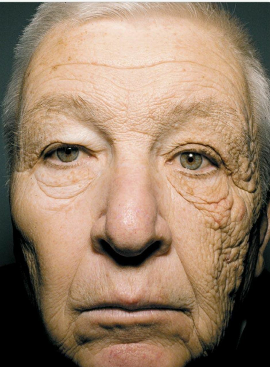 Os raios ultravioleta refletiam na janela e chegavam ao seu rosto, principalmente, o lado esquerdo e isso provocou o fotoenvelhecimento. Então se você achava que todo aquele assunto de usar protetor solar era papo furado, esta é a prova real de que não é bem assim. Às vezes, temos preguiça de usar o protetor, mas olhando para essa imagem você com certeza deve ter pensado melhor sobre incluir esse novo hábito em sua rotina.