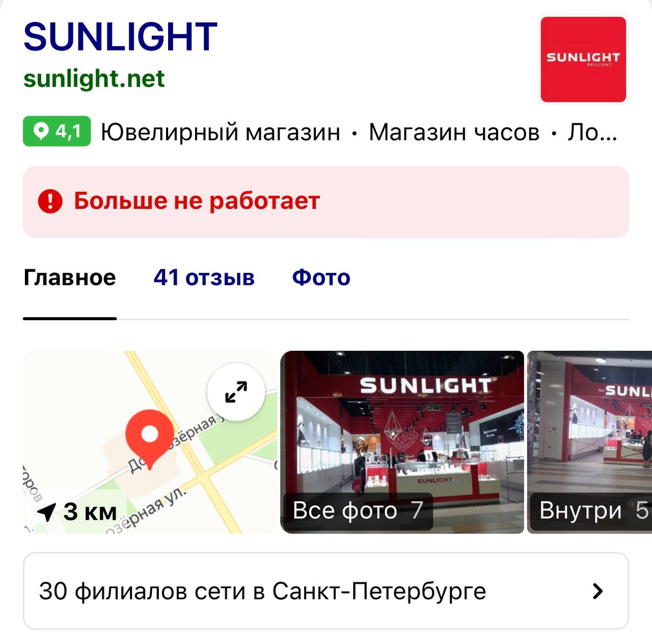 Помните вечно закрывающиеся магазины сети Sunlight? Ликвидация, скидки... Недавно я была в ТЦ, где был их бутик. И они реально закрылись! Теперь там другой ювелирный магазин.