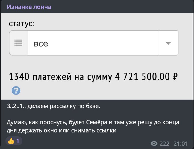 Доступ в канал стоил 3500 рублей. И вот только что натыкаюсь на суммы продаж — 4,7, мать их, миллиона рублей. И это за полдня)) Чем-то не тем мы занимаемся, ребят :D