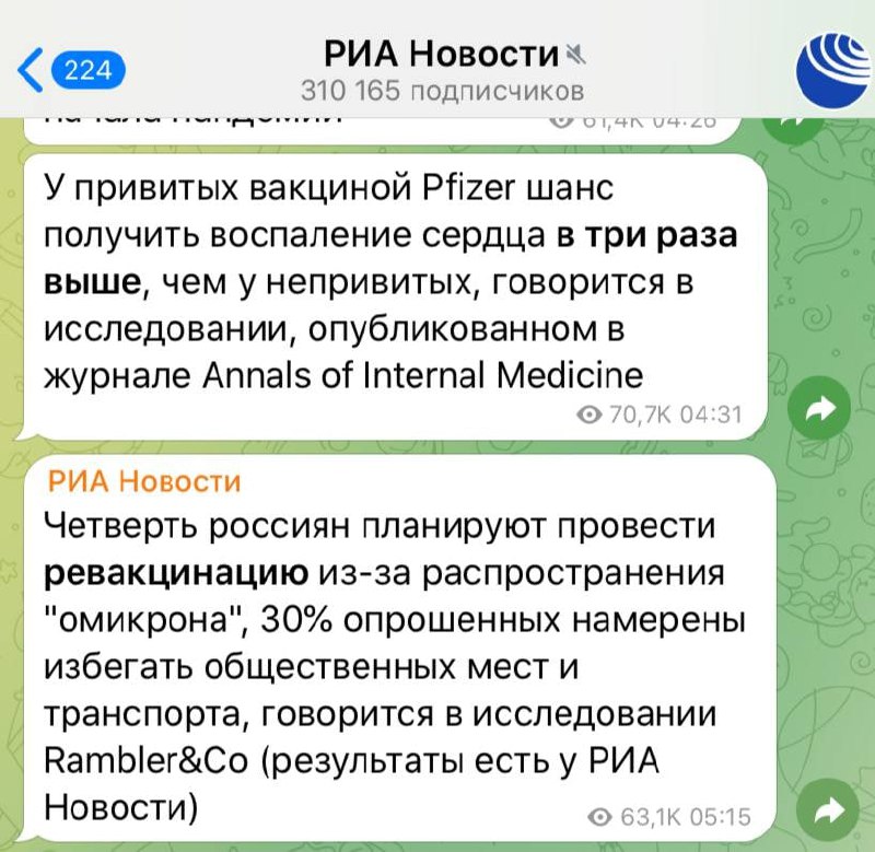 Примечательно, что с разницей в 45 мин в новостной ленте телеграм-канала государственного агентства вышла новость об ажиотаже вокруг ревакцинации от омикрона.