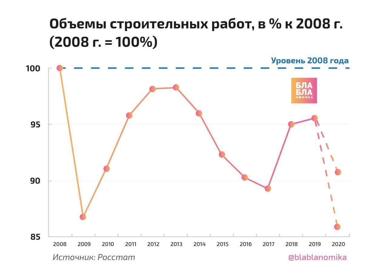 Марат Хуснуллин заключил, что его задача — «постараться оставить в стройке 90–95% объектов». При этом за год падение объёмов строительства, по его мнению, будет все-таки примерно 10%. А это значит, что у стройки шансов вернуться к показателям 2008 г. как не было, так и нет. И по итогам 2020 г. мы будем строить уже на 9-14% ниже, чем в 2008 г. А могли бы строить себе новое будущее...