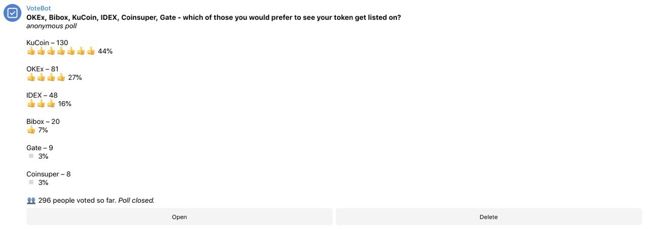 1. I was very surprised to see KuCoin majorly outperform other exchanges in the voting list. This basically means that KuCoin can be called a TOP-3 exchange for alts when it comes to accessible exchanges after Binance and Huobi. What I mean by ‘accessible’ is that Bitfinex kills alts, and Bittrex/Bithumb are not exclusively listing coins, so they do not count. Quite a revelation for many of us!