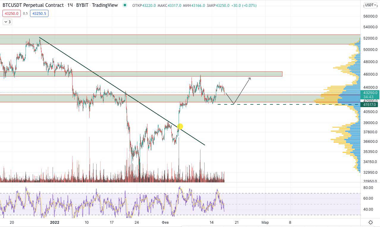 Если цена собирается двигаться вниз к $42700 - это все равно считается бычьим ретестом и хорошей точкой входа.