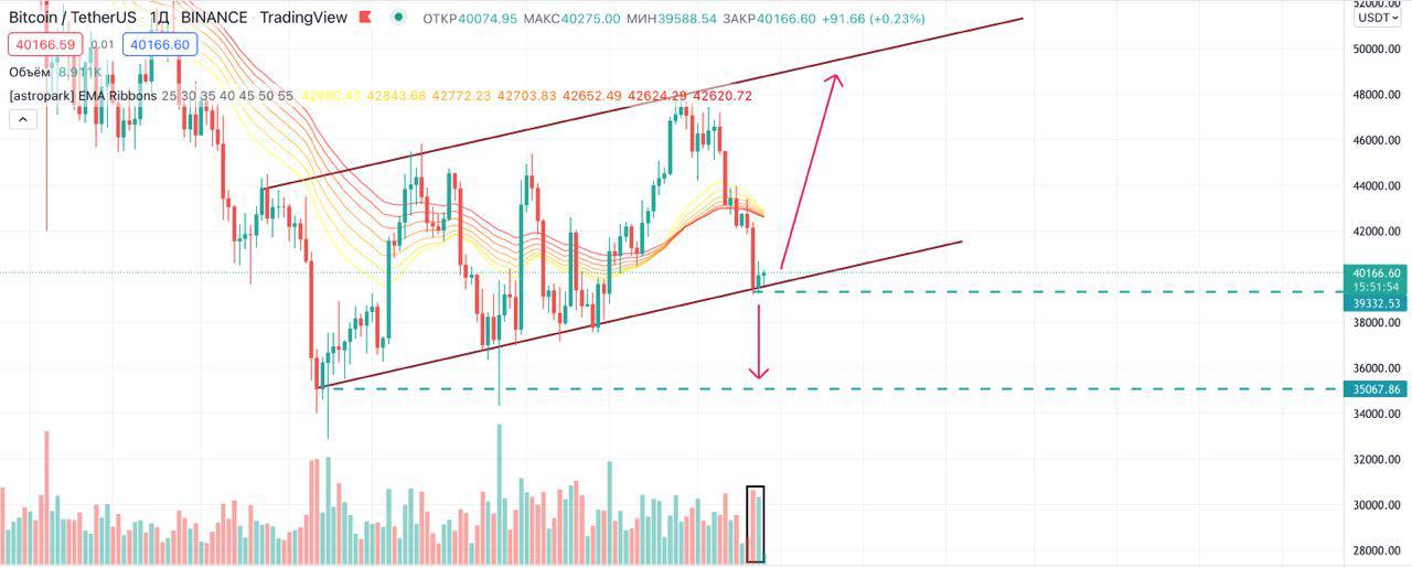 40.000 очень важный уровень, закрепляться ниже нельзя. Иначе есть все шансы опуститься вновь в район 32.000$.