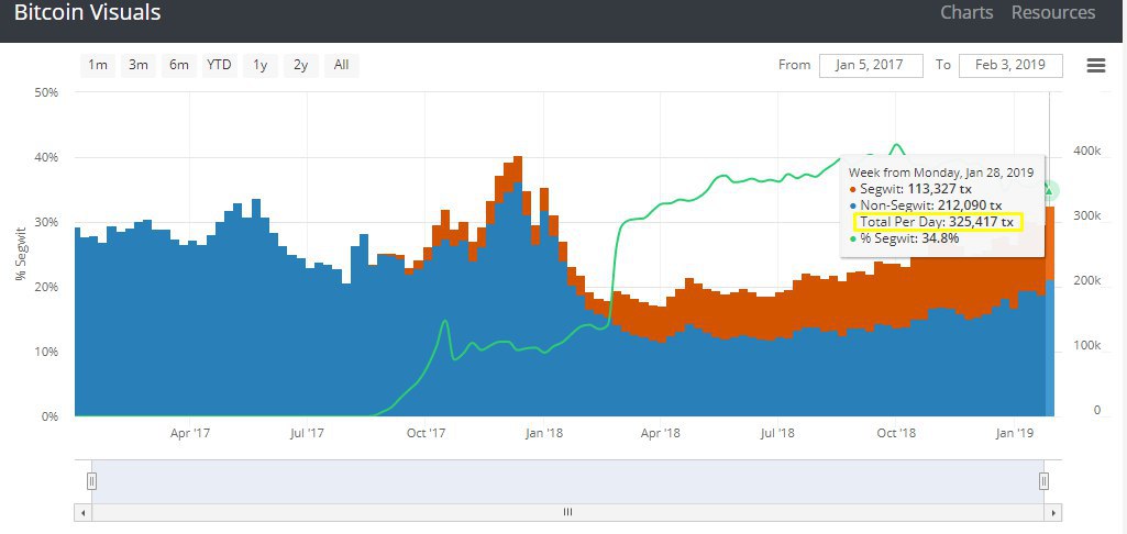 По данным сервиса Bitcoin Visuals, объем транзакций в сети биткоина достиг отметок конца ноября 2017 года.