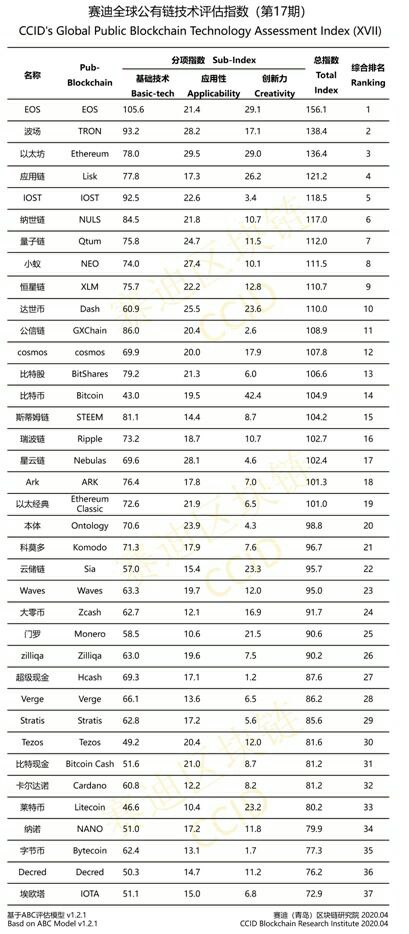 CCID начал выпускать рейтинги основных криптовалют в 2018 году и сейчас оценивает 37 криптоактивов по трем категориям. Результаты ежемесячного рейтинга уже давно вызывают споры, поскольку CCID очевидно отдает предпочтением китайским проектам. В этом месяце, почти как и всегда, первое место досталось EOS, за которой следуют TRX и ETH. Биткоин немного ухудшил позиции и упал с 11-го на 14-е место. Криптовалютные проекты оцениваются на основе трех категорий: базовая технология, применение и инновации. По оценкам первой категории – базовая технология, EOS возглавляет список, за ним следуют TRX и IOST. Как отмечает Центр, формирование рейтинга замедлилось из-за коронавируса, поэтому общая картина почти не изменилась. CCID поясняет: