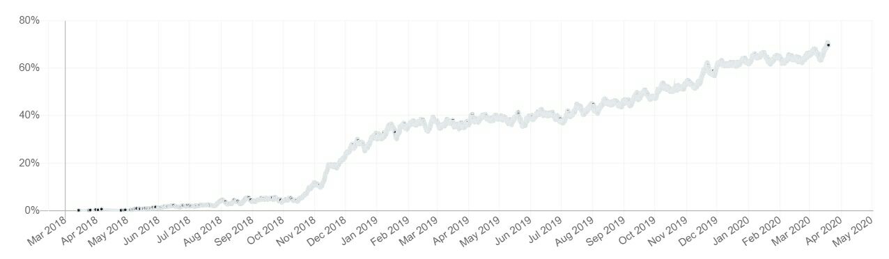 В 2018 году компания Braiins (оператор Slush Pool) выпустила прошивку с поддержкой AsicBoost, дающую майнерам рост прибыльности ASIC примерно на 13%. Наибольшую выгоду смогли извлечь те, кто раньше всех внедрил прошивку. На приведенном ниже графике демонстрируется рост использования технологии AsicBoost с 2018 года. Самый крупный скачок внедрения произошел в течение первых нескольких месяцев после выпуска прошивки. По данным Braiins, сегодня примерно 70% BTC добываются с использованием AsicBoost. Это означает, что AsicBoost уже перестала быть «козырем в рукаве» и лишь помогает не отставать от конкурентов. Но прогресс не стоит на месте, и появляются новые возможности увеличения прибыльности майнинга.