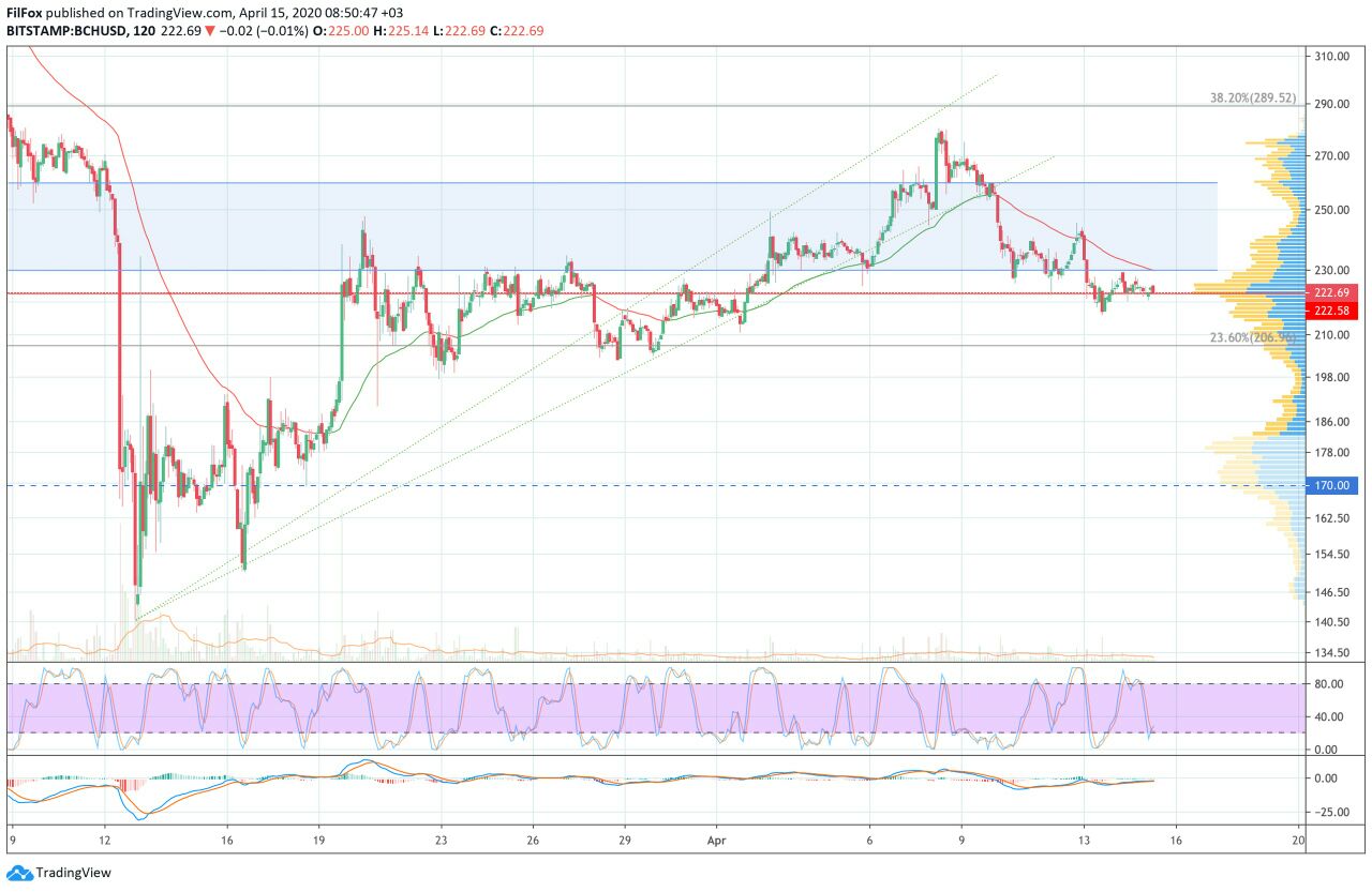 Большинство альткоинов удерживается в области средних цен, но смогут ли они сегодня продолжить восстановление? Вчера покупатели не смогли преодолеть сопротивление 230.00 USD. Цена bitcoin cash развернулась в откат, но линия POC (222.58 USD) остановила снижение.