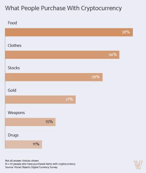 Из опрошенных лишь 16% действительно инвестировали в криптовалюты, поэтому результаты опроса можно считать представлениями обывателей. Согласно данным Visual Objects, реальные владельцы криптовалют тратят их далеко не так, как считает широкая публика. Они покупают еду (38%), одежду (34%), и целых 50% инвестируют в другие активы (29% в акции и 21% в золото) . Для покупки наркотиков и оружия криптовалюты используют 11% и 15% соответственно.