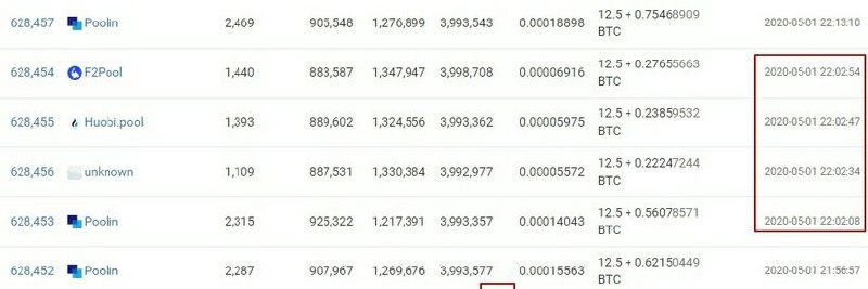 1 мая майнеры биткоина добыли 4 блока всего за 46 секунд. Такой резкий всплеск производства блоков может сигнализировать о том, что сложность майнинга на данный момент достаточно низкая. Напомним, что до халвинга биткоина 2020 года осталось менее двух недель.
