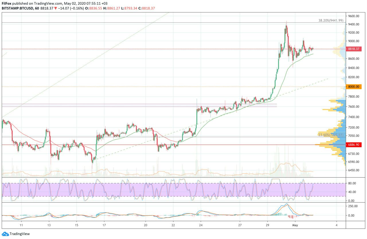 Достигнув уровня скользящей средней, давление продавцов ослабло. Ночью объёмы сократились ниже среднего уровня, и цена существенно сузила диапазон консолидации на уровне 8800.00 USD.
