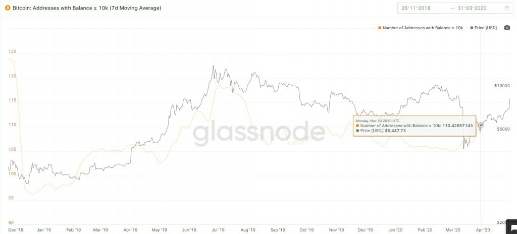 На графике от Glassnode видно, что число адресов с 10 000 BTC и более в среду достигло отметки 111, наивысшей с начала августа 2019 года. С начала марта 2020 года количество крупнейших биткоин-адресов выросло на 11%.