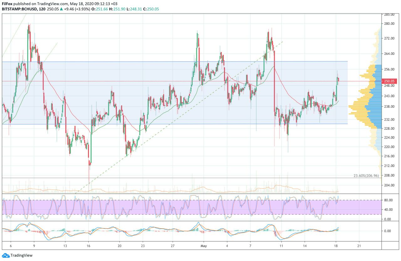 Вчера медведи обозначили недельный минимум, а сегодня покупатели попытаются исправить ситуацию и вернуться к уровню средних цен. Вчера медведи продавили линию POC (238.31 USD) и выбили пару BCH/USD из широкого голубого диапазона. В завершении дня продавцы установили минимум в районе отметки 220.00 USD.