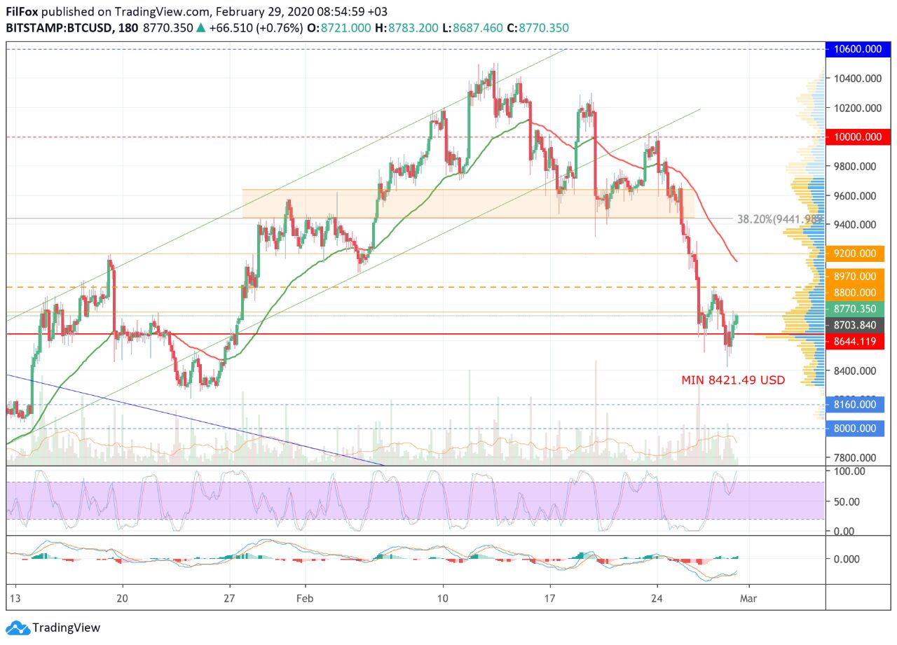 До конца недели цены могут остаться во флэте. Вчера продавцы проявляли активность, и цена Bitcoin не смогла удержаться в оранжевом боковом коридоре. Медведи продолжили натиск и обновили февральский минимум в районе отметки 8400.00 USD.