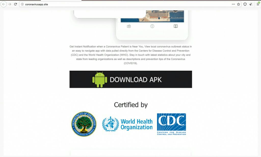 Исследователи специализирующейся на кибербезопасности компании DomainTools выявили рост числа доменных имен, упоминающих коронавирус. Один из подобных сайтов — coronavirusapp[.]site — предлагает пользователям установить Android-приложение, которое затем блокирует экран и требует заплатить в биткоине сумму, эквивалентную $100. На распространяющем мошенническое приложение CovidLock сайте утверждается, что ПО сертифицировано Всемирной организацией здравоохранения (ВОЗ) и Центрами по контролю и профилактике заболеваний США (CDC). Также хакеры утверждают, что приложение якобы уже скачало 6 миллионов человек.