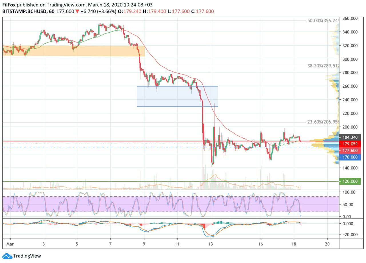 Если у покупателей не хватит сил на ложный бычий прорыв, то цены альткоинов продолжат снижение. Вчера часовая скользящая средняя EMA55 удержала пару BCH/USD от снижения, но объёмы торгов сократились, и у покупателей не хватило сил продолжить восстановление. В завершении дня пара закрепилась в очень узком диапазоне, в районе отметки 185.00 USD, и билась на этом уровне до сегодняшнего утра.