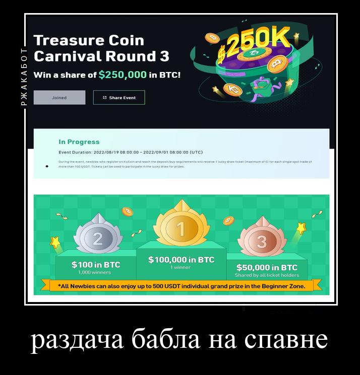О событии нигде нет инфы,даже на самом кукоине не найти акцию,и доступ к нему только по ссылке,пока всё внимание на фьючерсном турнире с призовым 10М,можем заабузить этот