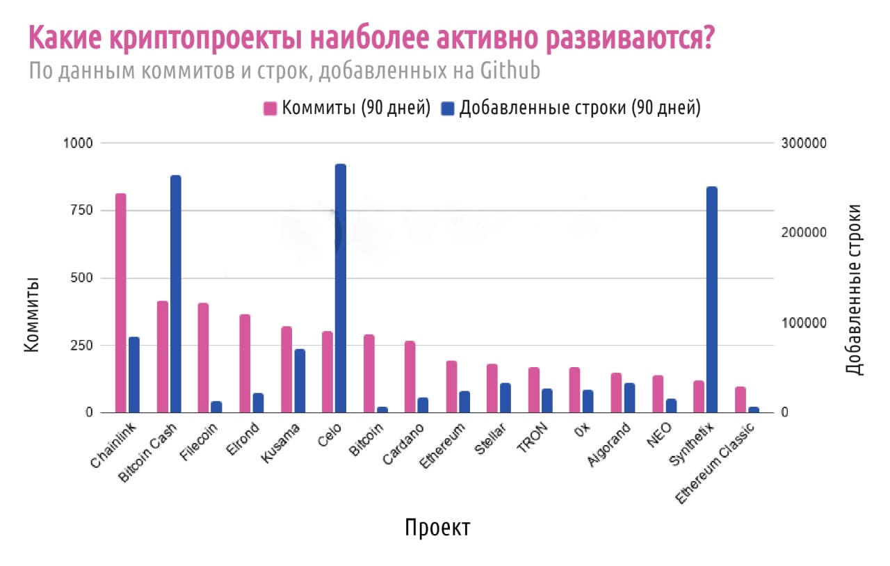 Оценка степени развития проектов производилась по средствам анализа активности в репозитории GitHub, а именно коммиты и добавленные линии в открытый исходный код.