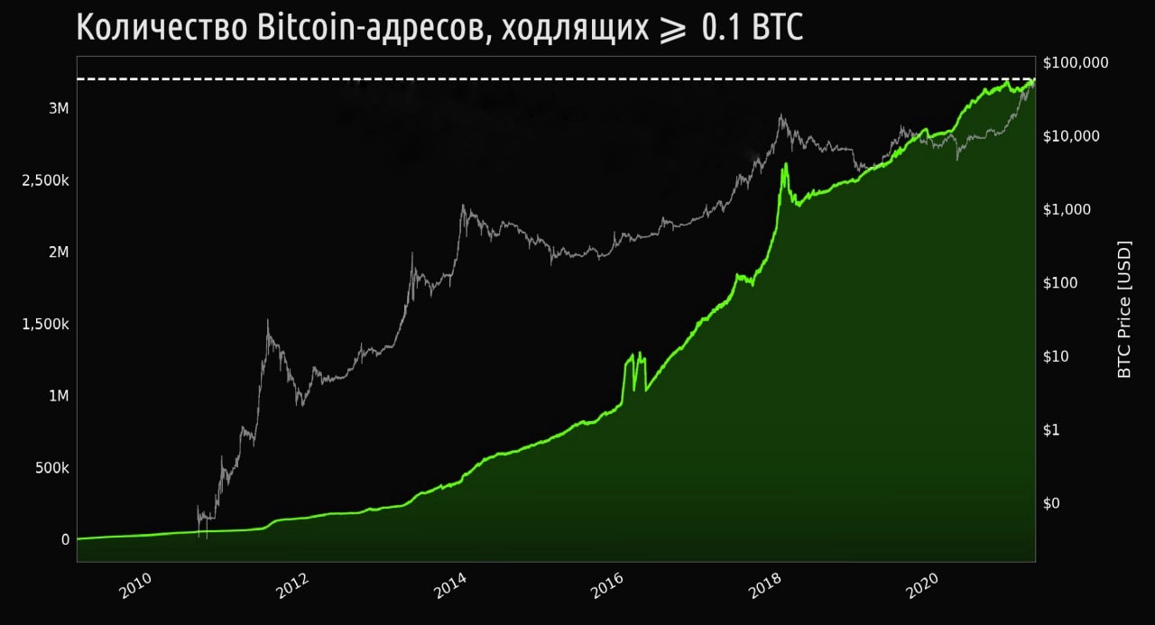 Новый исторический максимум по количеству адресов в сети Биткоина, которые содержат 0.1 BTC и более. Теперь их число составляет 3,200,302