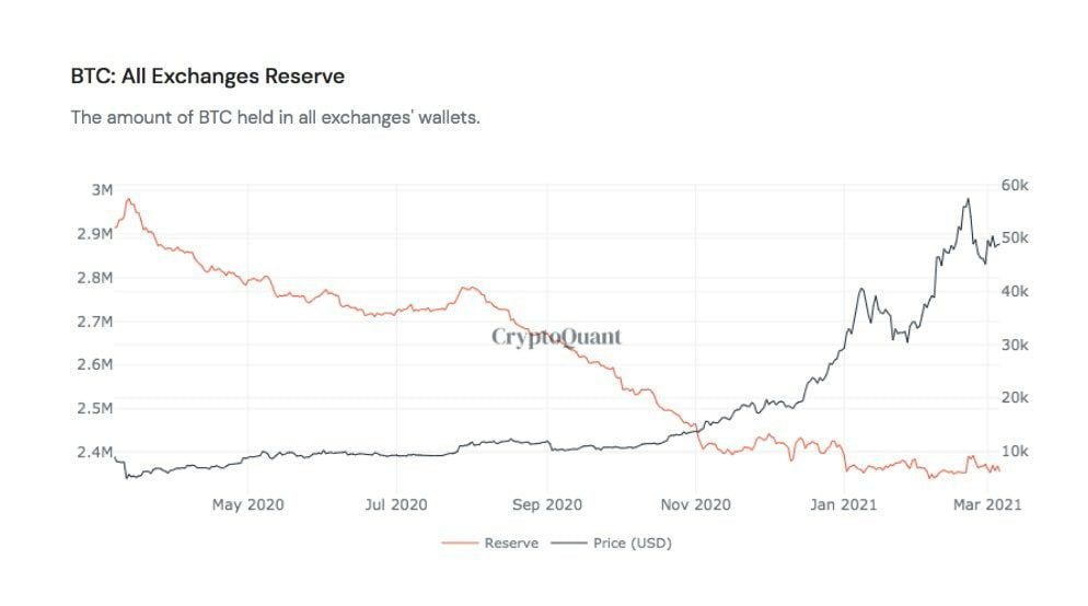За последний год с основных криптобирж вывели более 560 000 BTC. Резервы BTC на криптобиржах упали на 19%