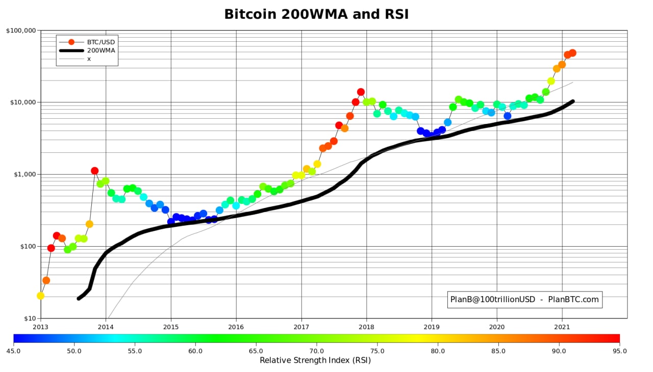 Аналитик PlanB обратил внимание, что период высокого индекса относительной силы (RSI) у биткоина в 2013 году составлял 10 месяцев, а в 2017 году — 8 месяцев. Сейчас индикатор находится на аналогичной стадии (оранжевые и красные точки) всего четвертый месяц — бычье ралли только начинается, считает PlanB.