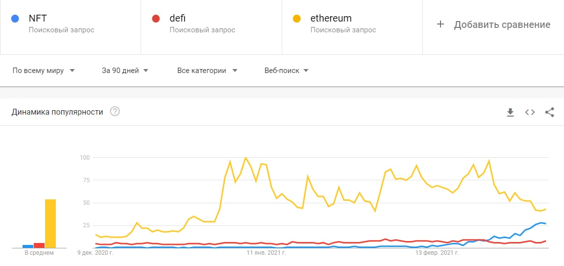 Интерес пользователей Google к Ethereum идет на спад, хотя после выхода обновления картина может поменяться. Интерес к NFT продолжает нарастать. С конца февраля невзаимозаменяемые токены гуглятся чаще, чем DeFi.