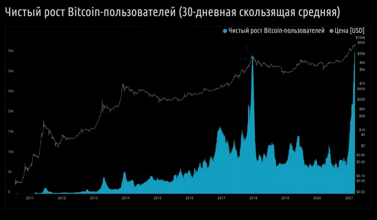 Темпы роста данного показателя сравнимы с пиком буллрана 2017 года. Это убедительный признак того, что в Биткоин входят новые розничные инвесторы.