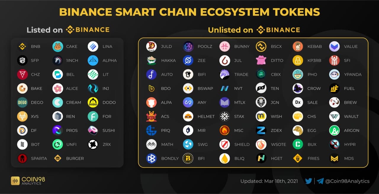 Токены, которые входят в экосистему Binance Smart Chain (BSC), часть из которых листится на Бинансе, а часть нет.