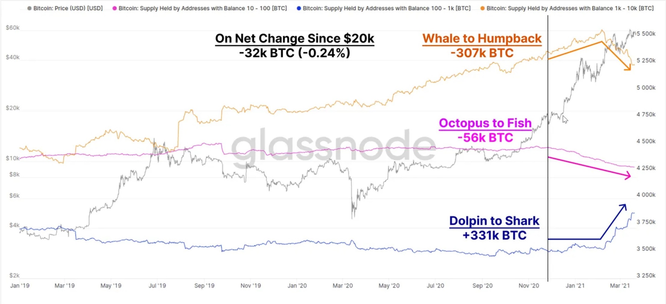 Таким образом, мелкие держатели биткоина владеют до 5,20% от всех добытых биткоинов. Как считают в Glassnode, постоянное скопление мелких держателей демонстрирует готовность ходлить криптовалюту из-за волатильности. Эта тенденция формируется с середины 2018 до 2020 гг.