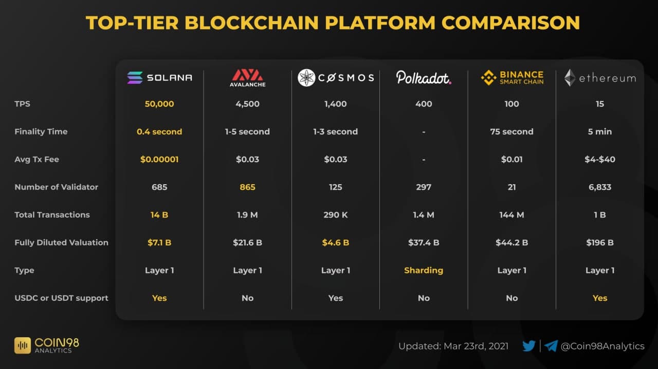 Сравнительная таблица различных блокчейнов по скорости и количеству транзакций, размерам комиссий, количеству валидаторов и общему объему транзакций.