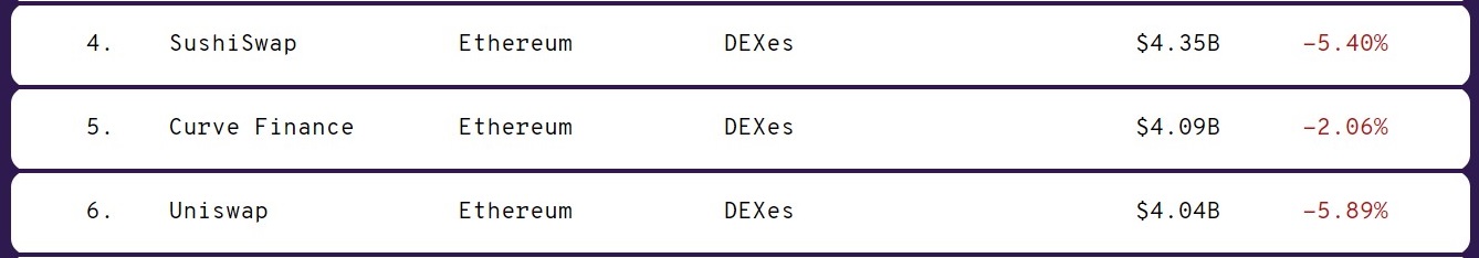 В рейтинге DEX от DeFi Pulse платформа Uniswap с показателем $3,94 млрд находится на третьей строчке, уступая по TVL SushiSwap и Curve Finance.