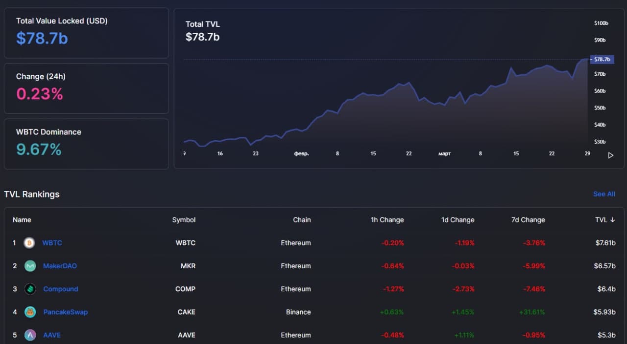 Объём средств, замороженных в DeFi-протоколах, на данный момент составляет $78.7 млрд — это новый абсолютный максимум.💯