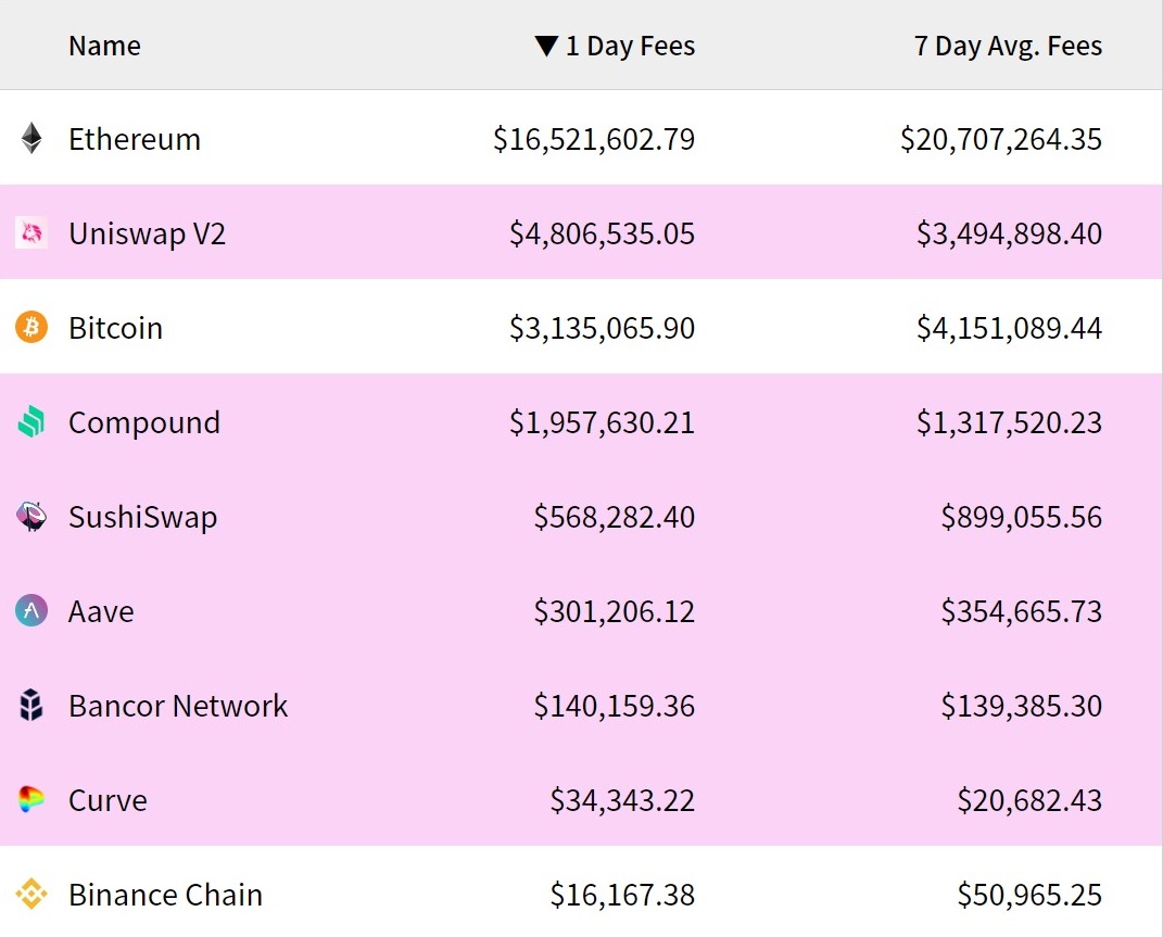 Эфириум остается лидером по суточному объему комиссий с $16.5 млн. Однако доминирование основанной на Эфириуме биржи Uniswap над Биткоином может быть недолгим, поскольку Биткоин опережает Uniswap по средней сумме ежедневных сборов за транзакции за последние семь дней почти на 20%.