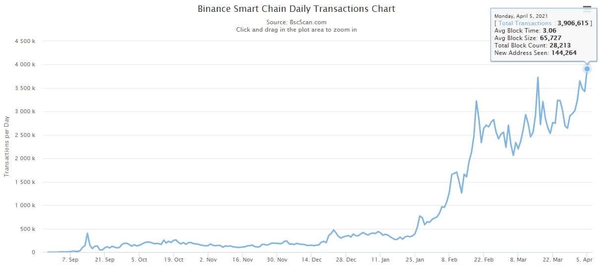 Дневной объем транзакций в BSC приближается к 4 млн, опережая аналогичный показатель в сети Ethereum на 300%.