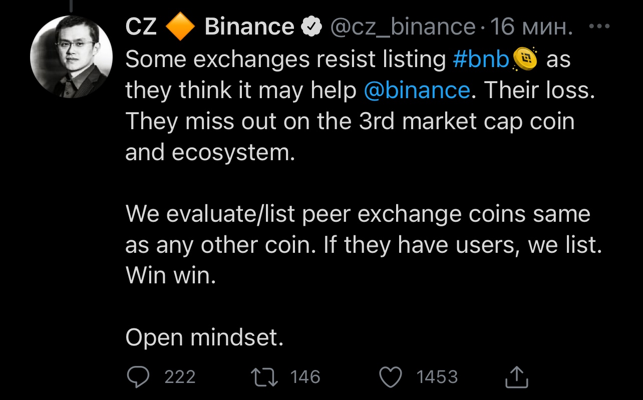 “Некоторые биржи сопротивляются листингу #BNB, так как считают, что это может помочь платформе #Binance. Их потеря. Они пропустили 3-ю рыночную монету и экосистему.