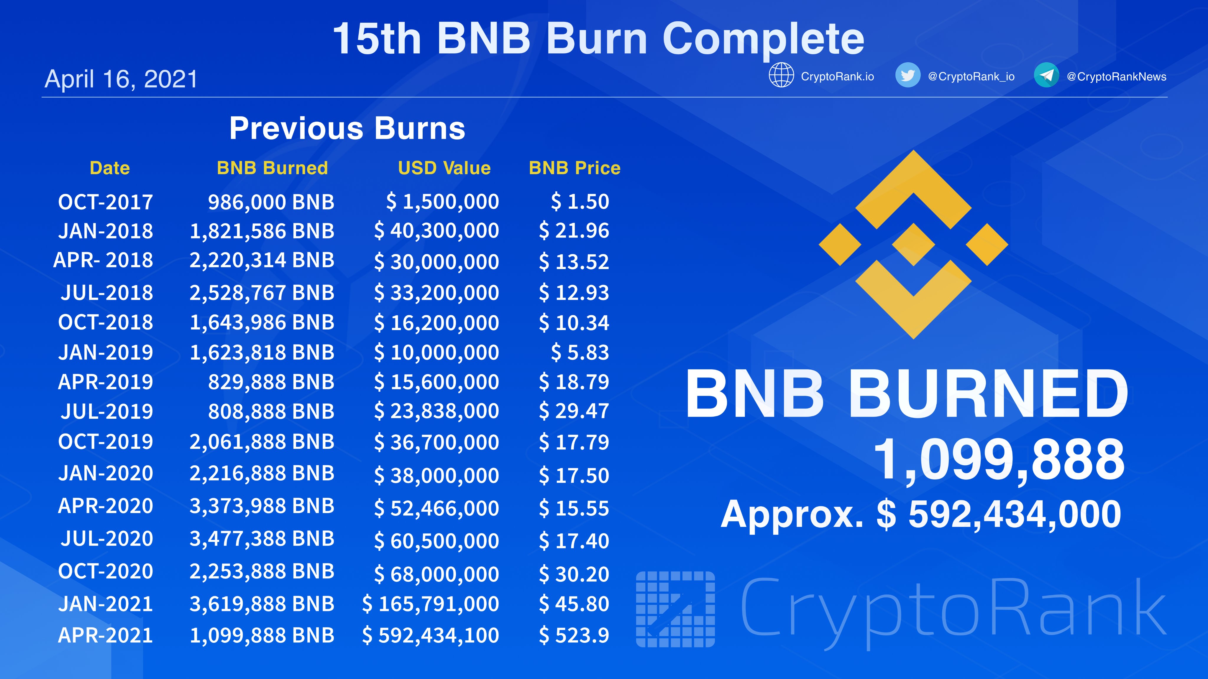 Биржа #Binance провела 15-е ежеквартальное сжигание в количестве 1,099,888 BNB.🔥