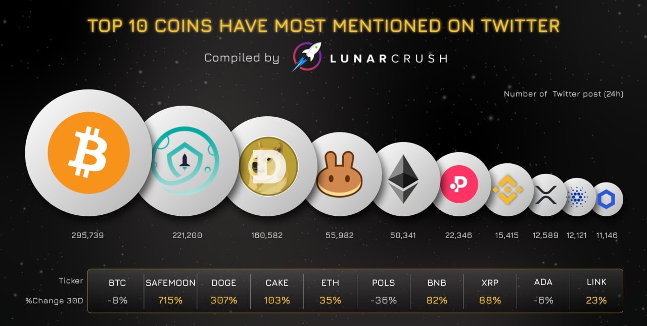 Топ 10 токенов, которые пользуются сейчас наибольшим количеством упоминаний в твиттере🔝
