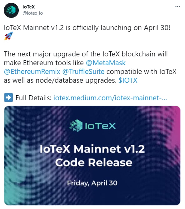 Важные новости для проекта IoTeX, 30 апреля состоится запуск основной сети Mainnet v1.2🔥