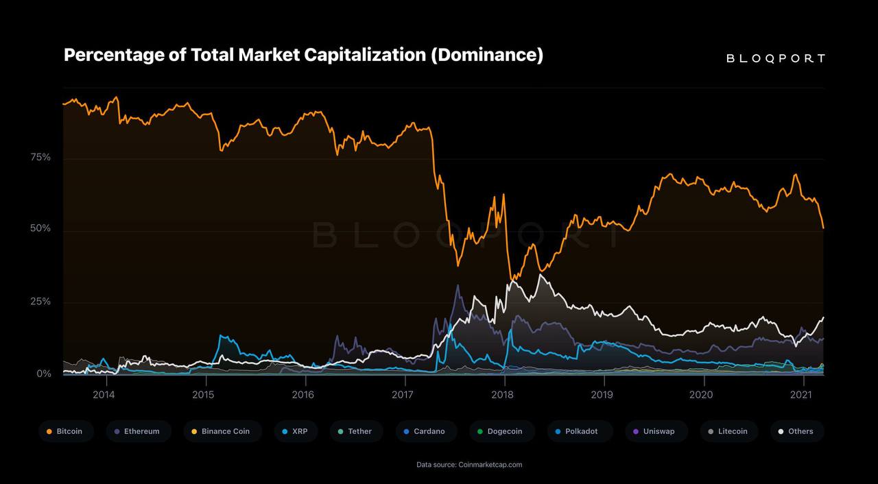 Исторически считается, что сокращение рыночной доли биткоина менее чем до половины совокупной капитализации криптовалют знаменует начало сезона альткоинов.